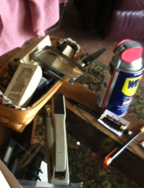 #7 - Keep the Essentials Handy. What's a coffee table for if not for keeping everything you need nearby. Dad's stash of stuff is a great summary of how Fletch rolls: harmonica, magnifying glass, pencils, stapler, and WD40. He's ready for anything!