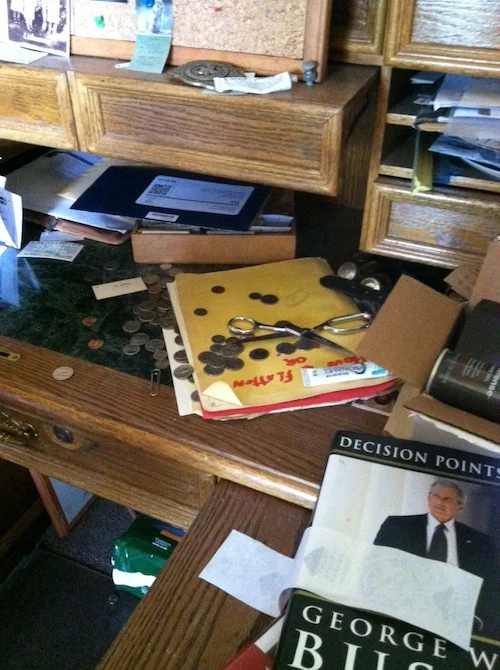 #2 - There's nothing wrong with a messy desk. In fact, if you want to play a quick game of I-SPY with the kids, there's no better place to go than Papa's office! See if you can spy a paper clip, a tube of toothpaste, and a belt buckle.